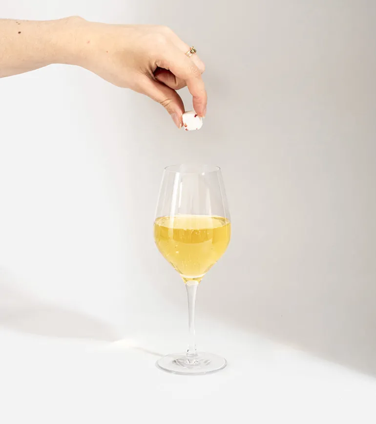 - Étape 1 : Dans une coupe de vin ou de champagne, mélangez un cube à une cuillère à soupe d’eau.