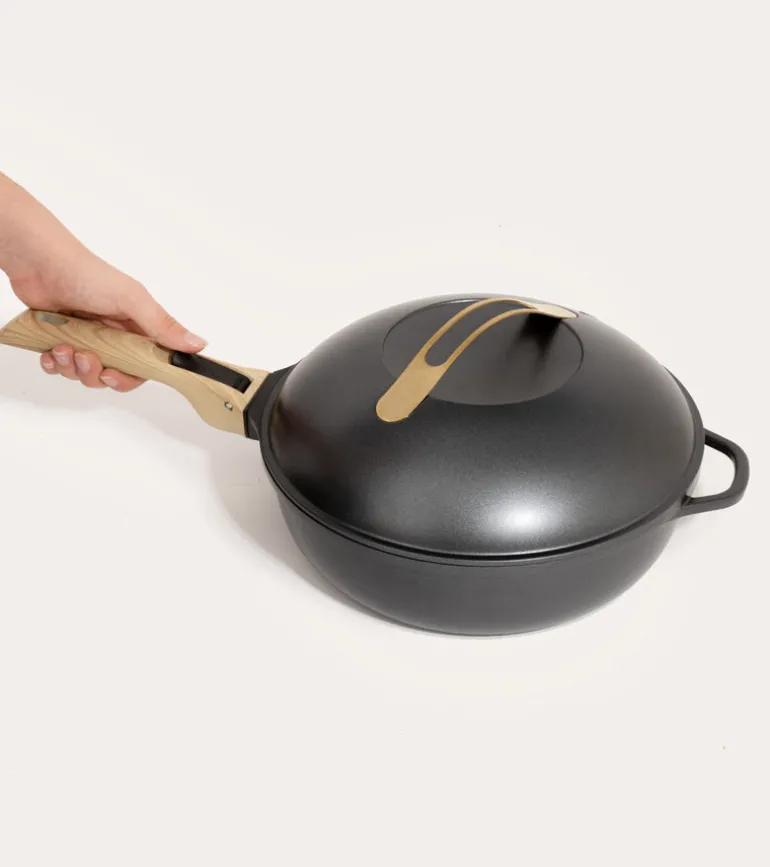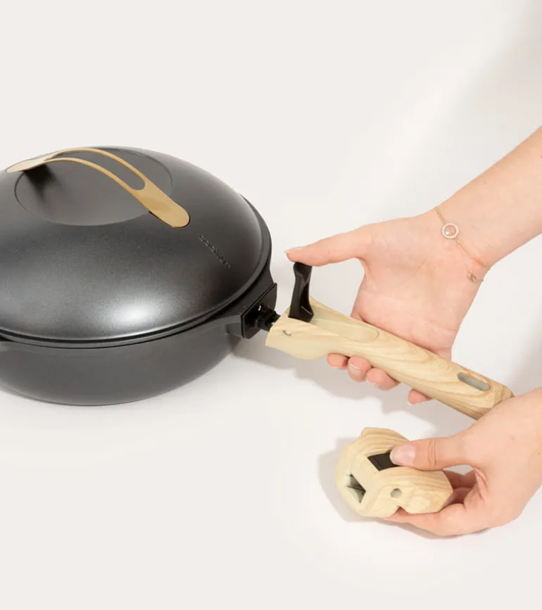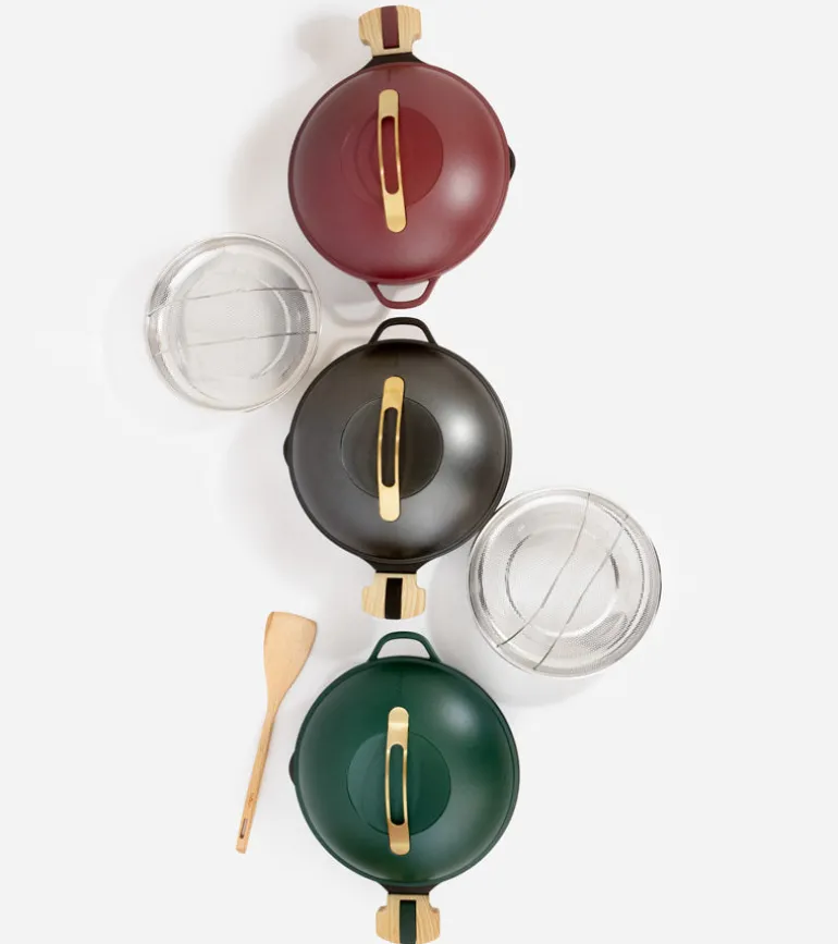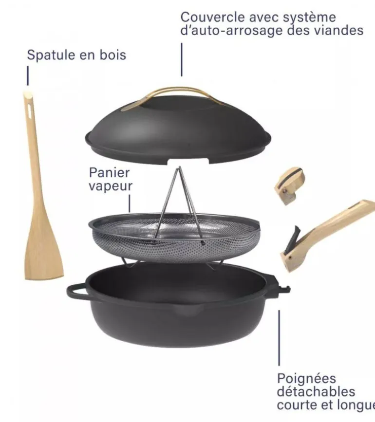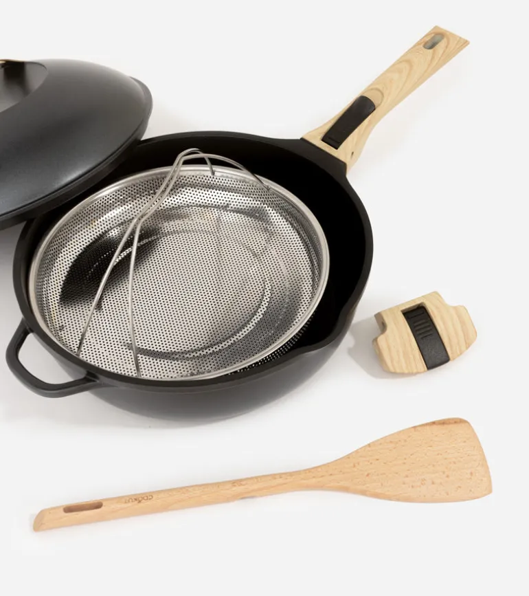 - Inclus : 2 poignées détachables (une longue et une courte), un panier vapeur et une spatule en bois.