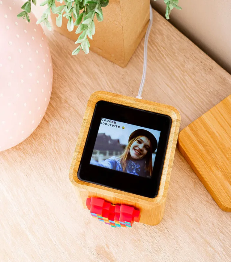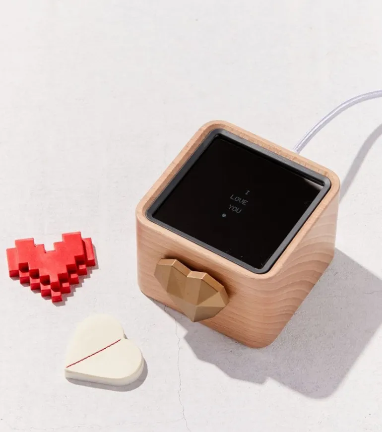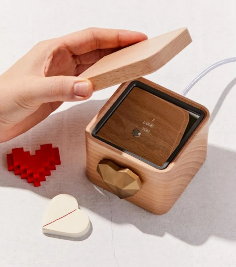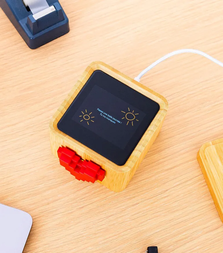 La Lovebox est une boite à amour connectée qui permet d’échanger d’une façon privilégiée avec nos proches et qui fait de chaque message envoyé un cadeau ! Vous pourrez envoyer des messages, des dessins, des emojis ou même des photos de votre smartphone à la Lovebox via une application. Lorsque vous recevez un message, le cœur se met à tourner et clignoter. Attention, ça va faire tictac boom boom dans votre petit cœur !