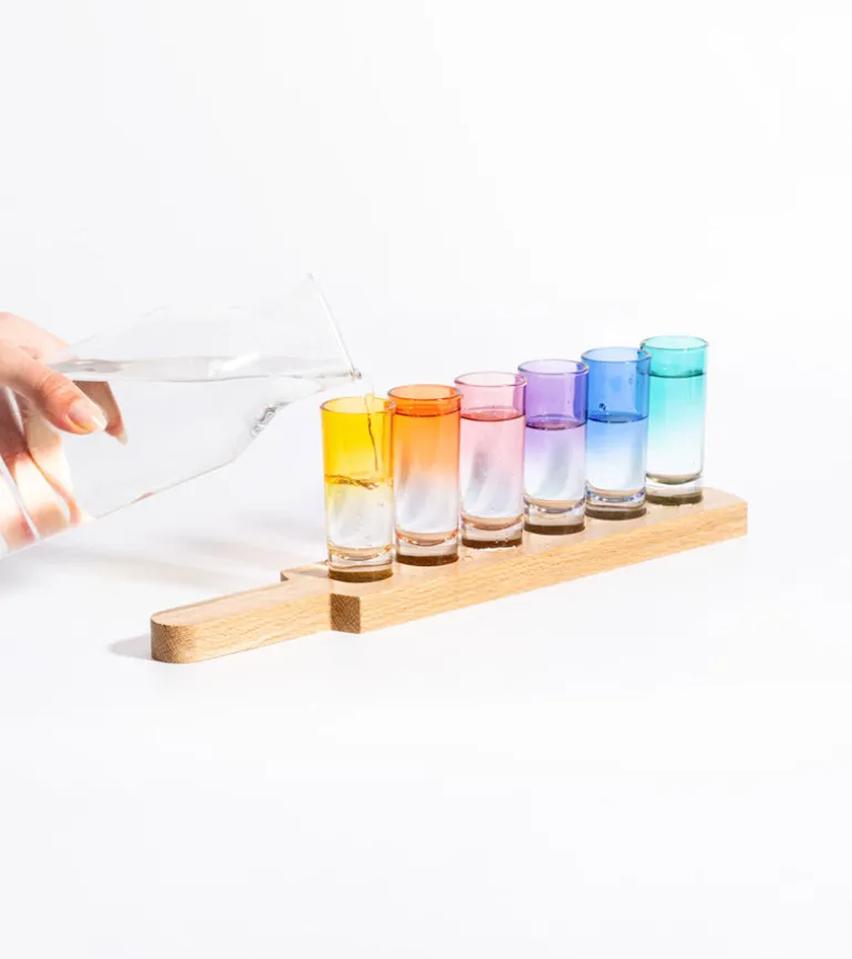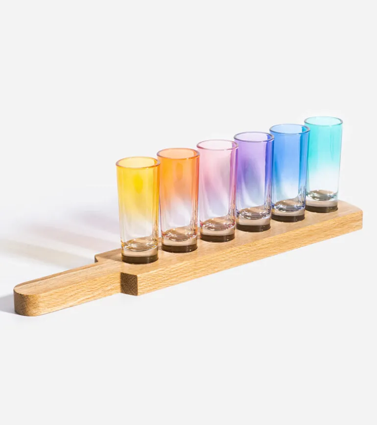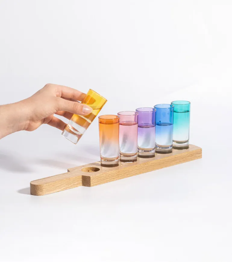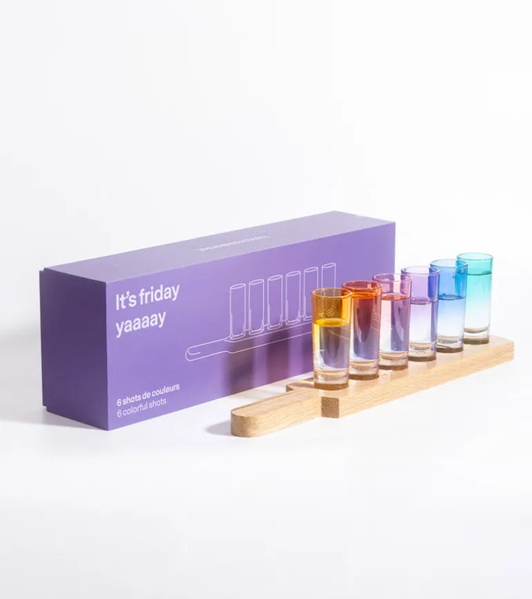 It’s friday yay ! Voici les shots multicolores alignés sur une planche en chêne, prêts à transformer vos soirées en une palette de chaos et de rires ! 🌈🥃