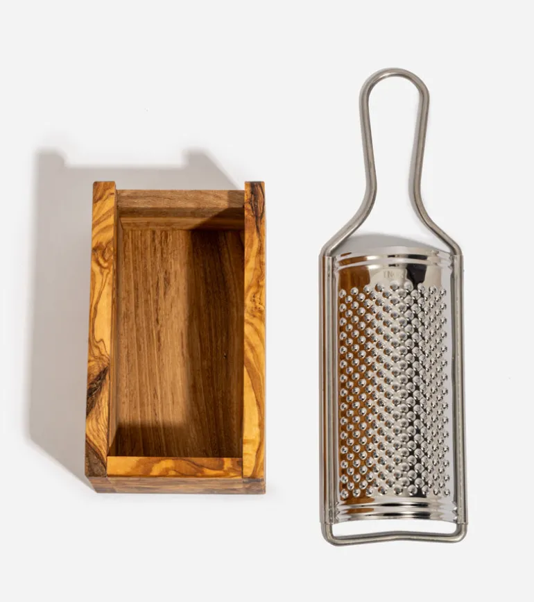 - La boîte en bois d’olivier qui accompagne la râpe est conçue pour récupérer les morceaux et minimiser le désordre