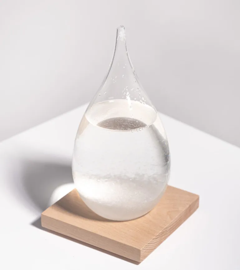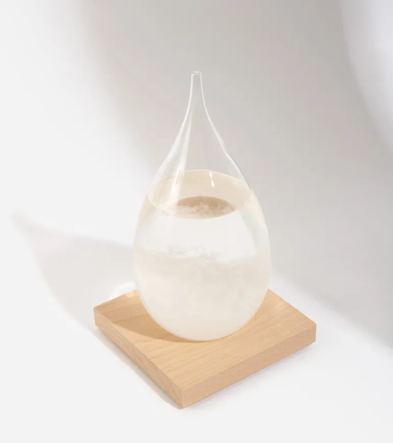 Un outil fascinant utilisé depuis les années 1750 par les voyageurs en bateau et même par Charles Darwin ! Le Storm glass, baromètre à cristaux prédira mystérieusement le temps : des cristaux visibles signifient un temps humide et brumeux, un verre nuageux avec de petits cristaux vous dira qu’un orage est en route et un verre clair signifiera un temps clair