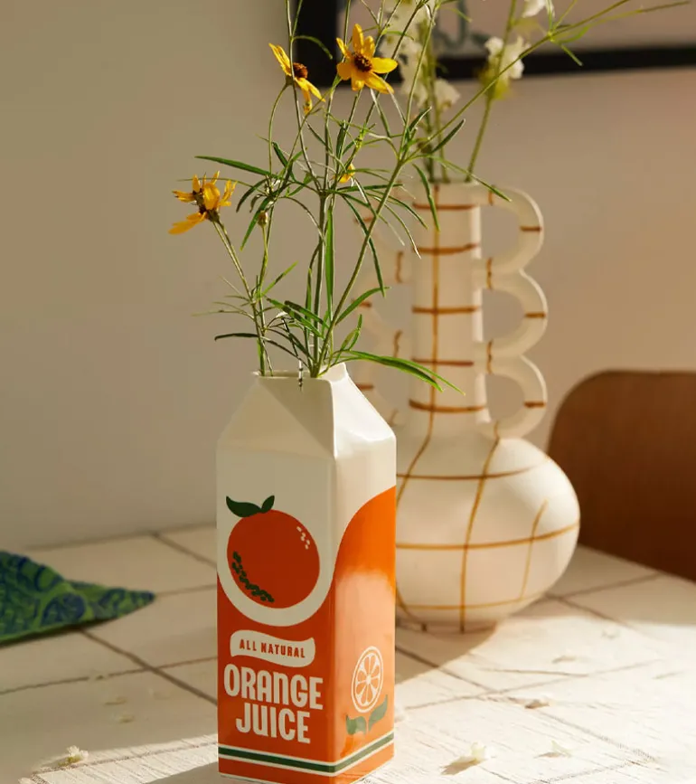 Dites bonjour aux vases originaux et pétillant ! Avec sa forme déjantée de brique de jus d’orange, notre vase apporte une touche vitaminée à votre intérieur. Transformez vos fleurs en un cocktail de fraîcheur funky !